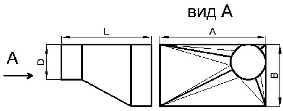 Данный переход стыкует прямоугольные воздуховоды с круглыми. Смещение является угловым вправо.