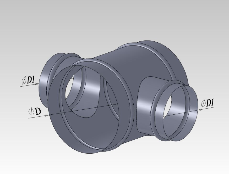 Крестовины располагаются на пересечениях перпендикулярных направлений воздуховодов. Задача крестовины - герметично соединить четыре воздуховода, обеспечив равномерное распределение идущих по ним воздушных потоков. Круглая крестовина позволяет стыковать три воздуховода круглого сечения. Исходя из их параметров подбираются диаметры основного участка крестовины и врезок.